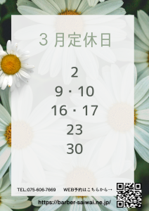 少し遅くなりましたが3月の定休日をお知らせいたします。